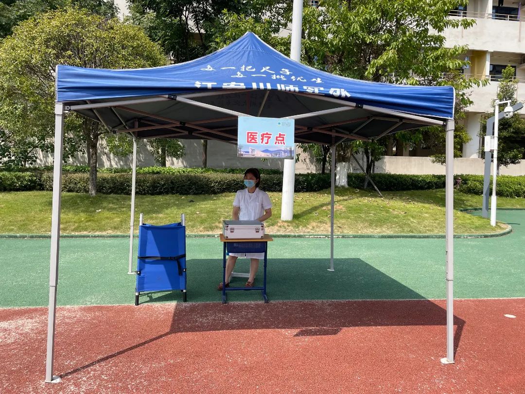 为了避免演练中发生意外,医务室的工作人员一直在医疗点待命。