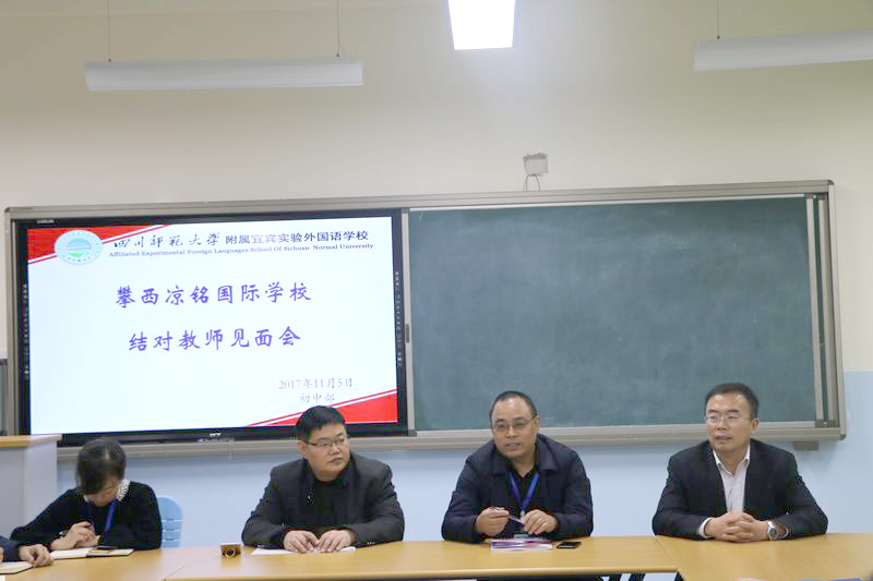 会议第一项:攀西凉铭国际学校的周海艳老师介绍攀西凉铭国际学校的领导和教师团队,张映梅主任安排培训结对教师及办公室。随后,川师宜宾实外和攀西凉铭国际学校的结对教师相互认识。